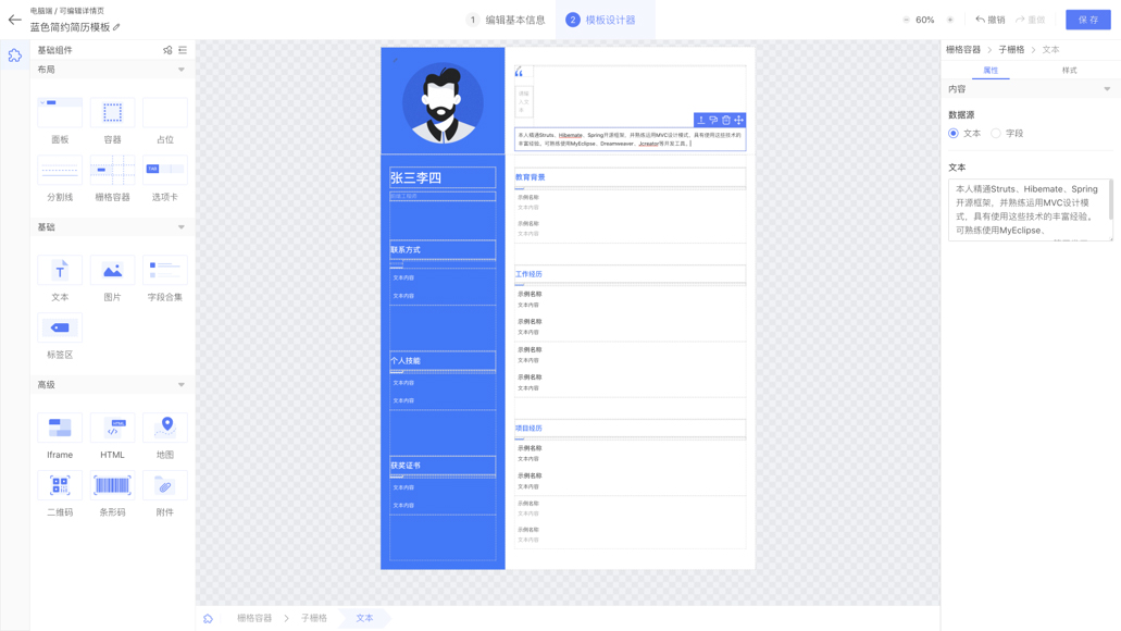 针对简历页面基于设计师平台可以快速设计出多种页面样式,满足不同客户的多样化业务需求